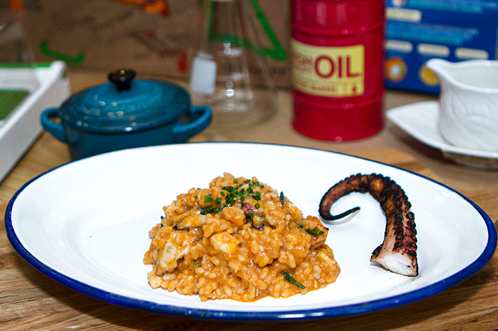 Receta de arroz meloso con pulpo seco, pescado y algas salicornia, un plato con mucha profundidad y sabor a mar.