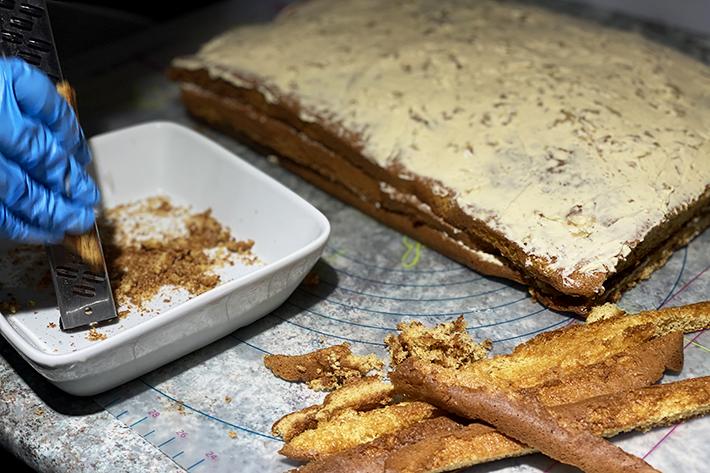 15.- Con un rallador, rallar los recortes del bizcocho sobrantes aprovechándolos, así, para la decoración.