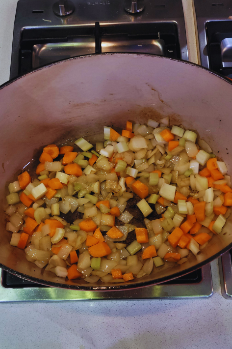 2. Bajar el fuego, incorporar el aceite restante y pochar en él las verduras de la mirepoix: primero la cebolla, rascando con una espátula el fondo con su jugo, después la zanahoria y el apio.