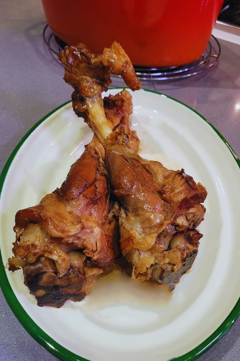 7.Una vez terminada la cocción la carne estará muy tierna, se desprende sola del hueso. Retirar los jarretes y reservar en el horno caliente, pero apagado.