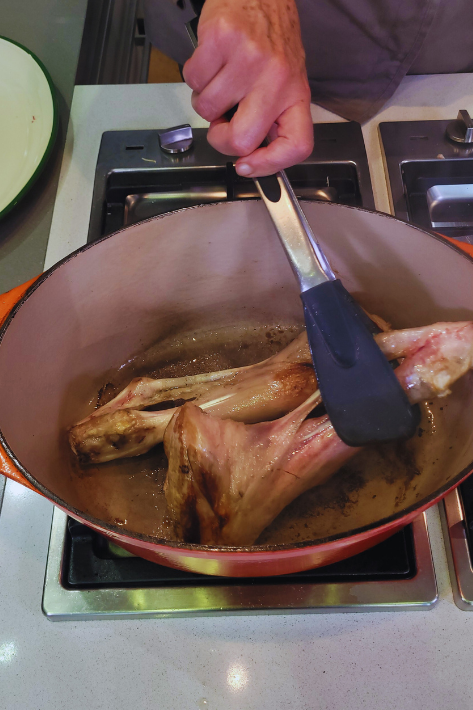 1.Calentar dos cucharadas de AOVE en la olla de hierro. Sellar los jarretes con el fuego fuerte, con una pinza darle la vuelta hasta que estén bien tostados por todo su contorno. Retirar y reservar.