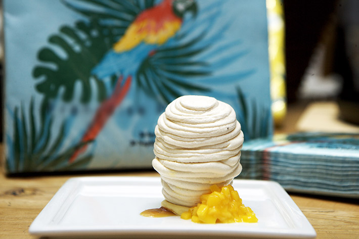 12.- En un plato disponer una cucharada de relleno, una cucharadita de reducción de azafrán. Colocar encima el merengue y acompañar con 10g de mango picado con un cuchillo en brunoise (cubos pequeños) y endulzado si hiciera falta con azúcar a gusto.