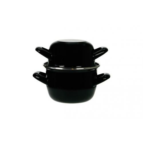 Cazuela especial para mejillones en acero inoxidable y color negro brillante. Consta de una cazuela principal y una tapa especial con asas. Tiene un diámetro de 18cm.