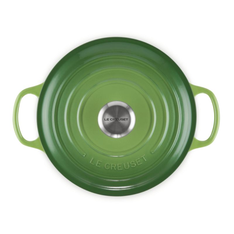 Volcánico, el primer color de esmalte de Desaegher y Aubecq, inspirado en el tono naranja incandescente que presenta el hierro fundido líquido en el interior de los moldes de fundición, se ha convertido en su color insignia, si bien hoy en día Le Creuset varía y actualiza sus colores cada temporada.