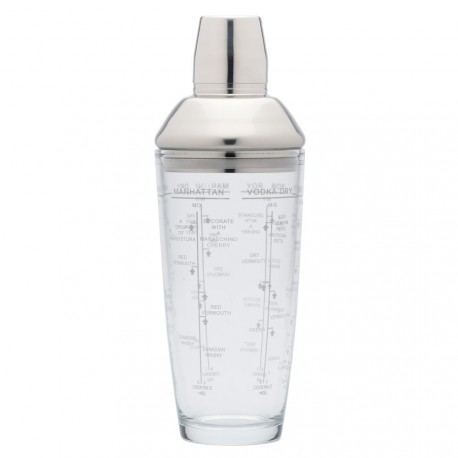 Coctelera de cristal con vaso, collarín y tapa de acero inoxidable con las recetas grabadas en el exterior.