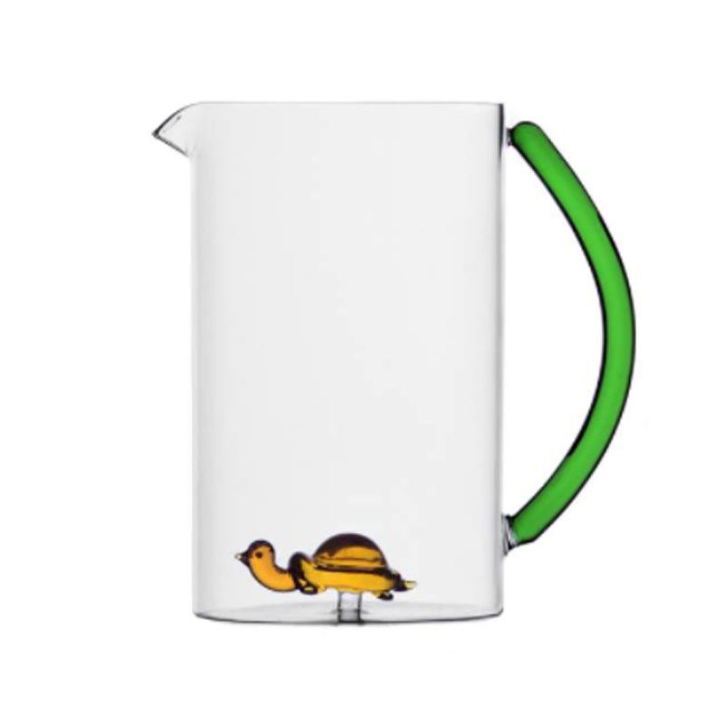 Jarra de cristal hecha a mano en cristal de borosilicato de alta calidad, transparente y cilíndrica con original figura de tortuga en su interior. Jarra que incorpora pico vertedor y asa lateral de color verde.