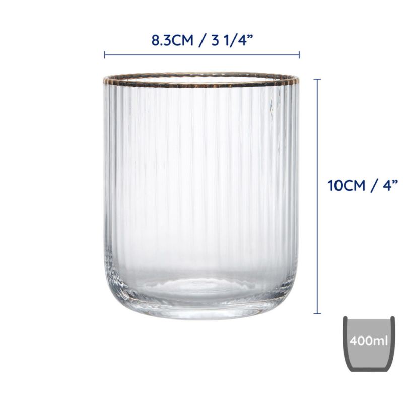 Juego de 4 vasos Sorrento de cristal estriado con borde dorado y capacidad de 400ml, ideales para servir tus bebidas favoritas con estilo. Son perfectos para cualquier tipo de bebida.