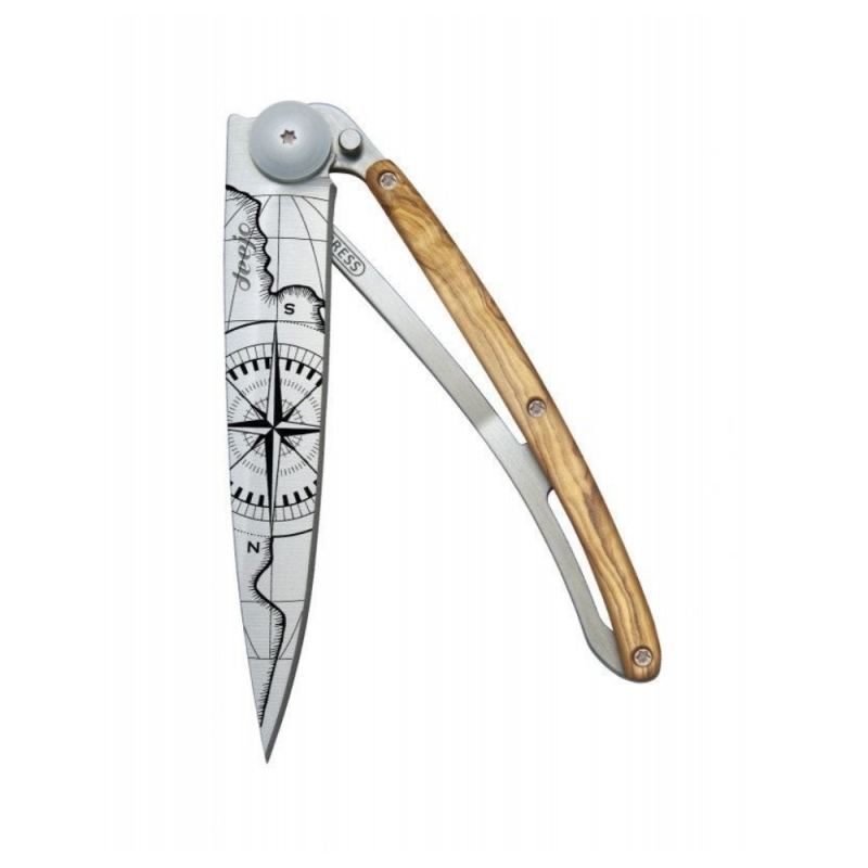 Navaja Deejo Tattoo con hoja de acero inoxidable plegable y motivo de brújula grabado en láser, el mango de esta navaja está fabricado en madera de olivo. La navaja viene presentada en un bonito estuche magnético.
