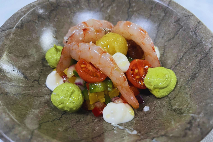 Entrada: Gamba blanca con licuado de hierbas, aguacate y piriñaca andaluza