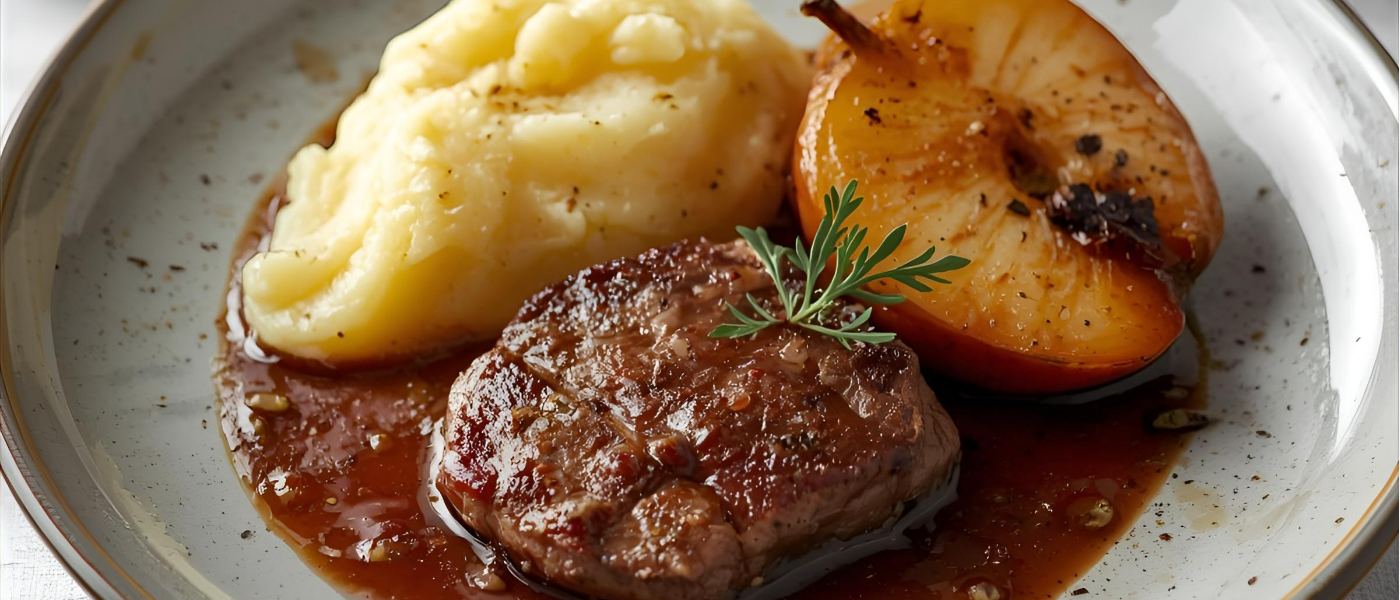 Segundo plato: Solomillo con salsa de chalotas al vino tinto, acompañado de puré de patata y manzana asada.