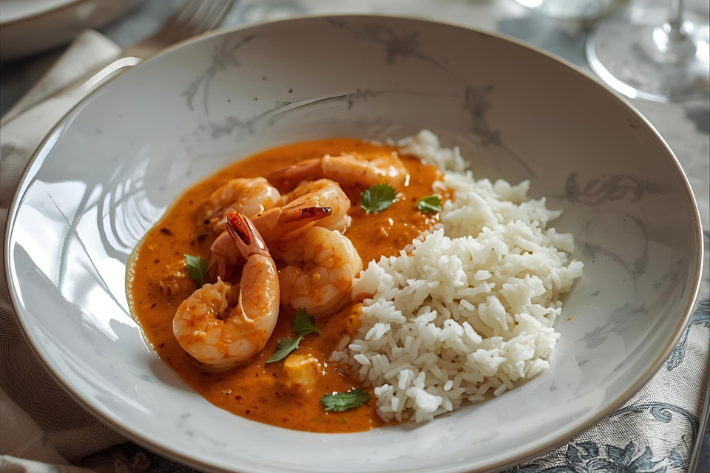 Primer plato: Gambones en salsa cremosa de chile chipotle, servidos con arroz basmati.
