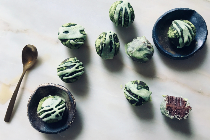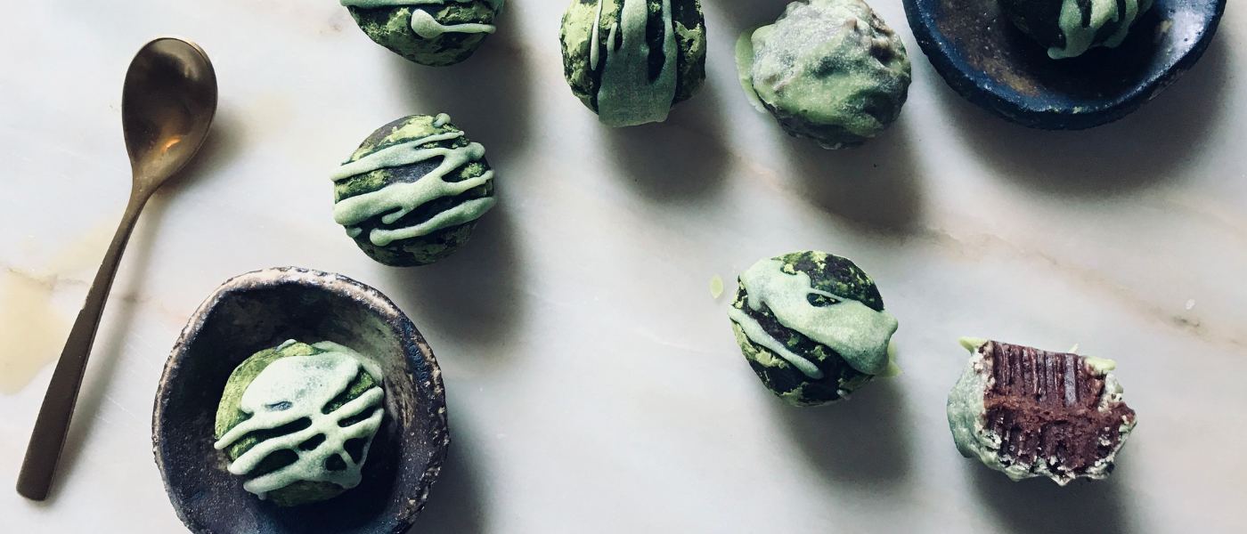El plato principal propone tofu macerado con zanahorias glaseadas, setas y harissa, una combinación completa en sabor, proteína vegetal y carácter especiado. El cierre dulce llega con trufas de matcha y crema de granada, un postre delicado que combina notas amargas, frescas y frutales, poniendo el broche final a una experiencia consciente y nutritiva.