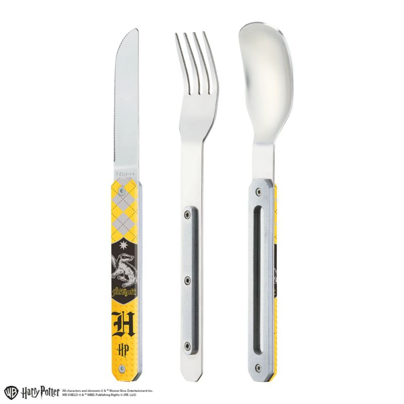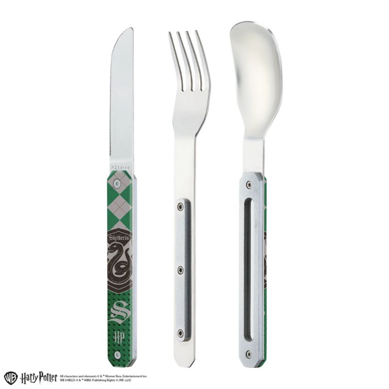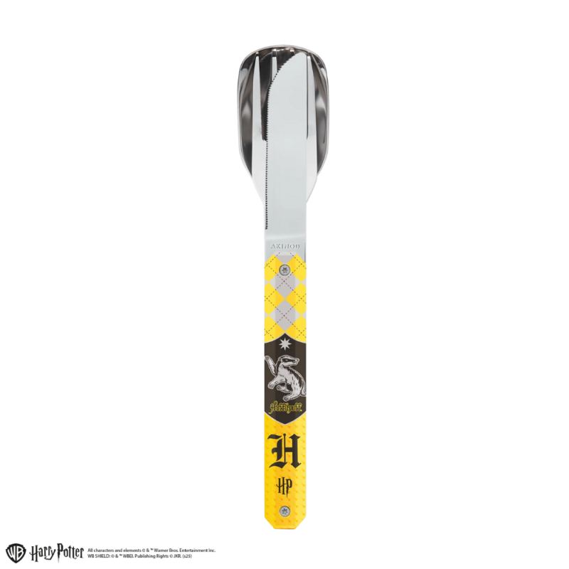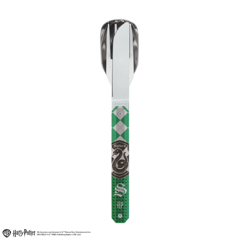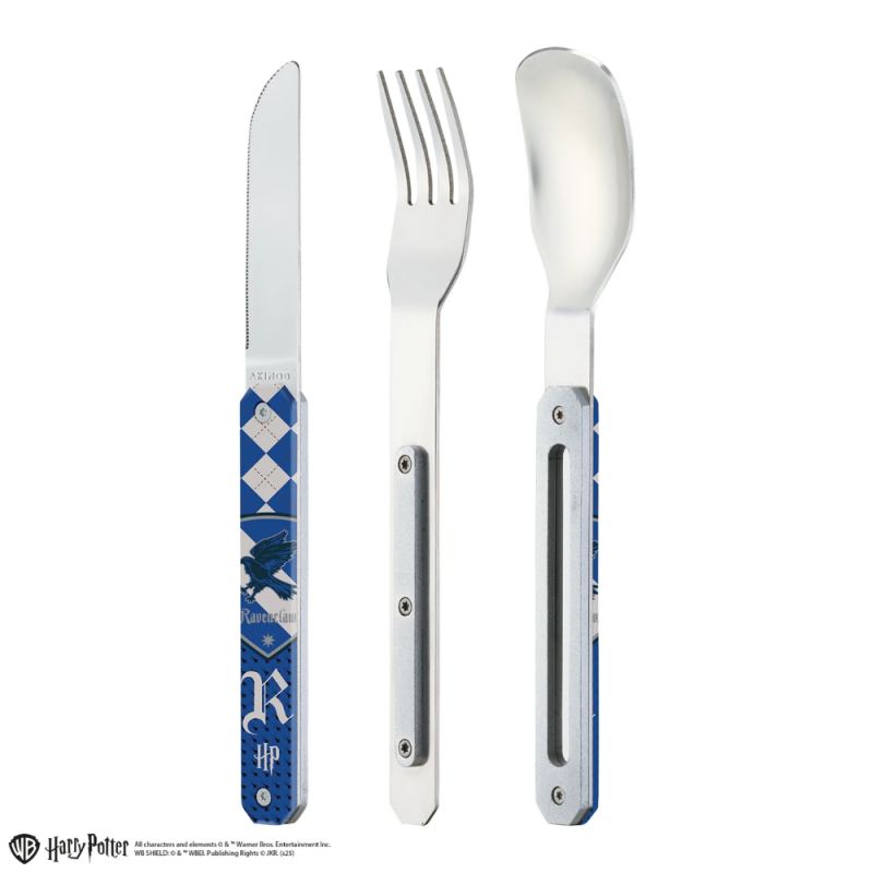 Este juego de cubiertos ofrece versiones con los emblemas y colores de las cuatro casas de Hogwarts: Gryffindor, Slytherin, Ravenclaw y Hufflepuff. El conjunto incluye una gran cuchara, un tenedor de 4 puntas y un cuchillo con hoja microdentada, fabricados en acero inoxidable martensítico 2CR14 con acabado espejo, y un mango de policarbonato transparente decorado con los escudos de cada casa. Gracias a su diseño magnético, las piezas se acoplan entre sí, haciendo el transporte más seguro y compacto.