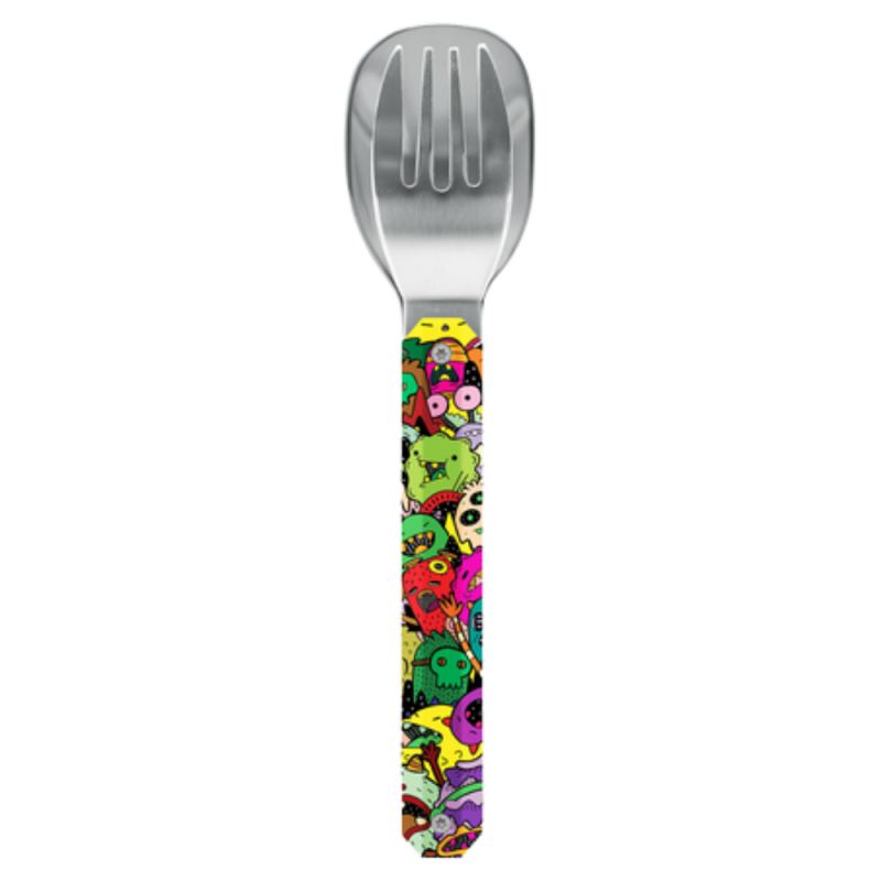 Juego de cubiertos mini imantados de 2 piezas en acero inoxidable 2CR14 con acabado espejo y mango de polímero transparente decorado “monsters”, ideal para llevar en tupper a la oficina, clase, picnic o viajes.
