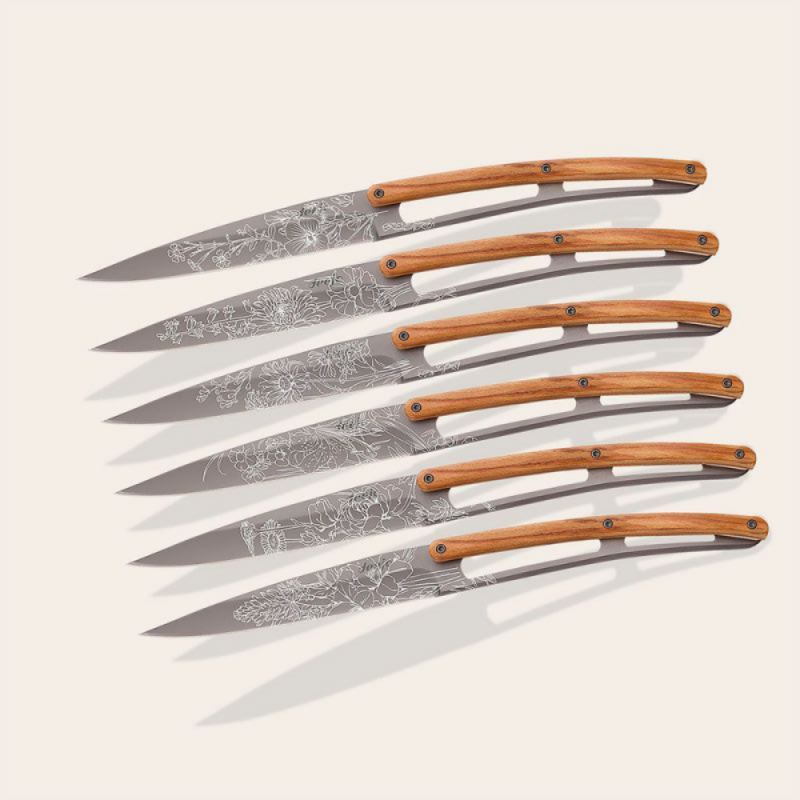 Juego de cuchillos de carne para mesa Deejo Blossom con hoja fija (no plegable) de acero inoxidable 2CR14 y acabado titanio. Cuentan con un diseño distinto para cada hoja inspirado en los distintos tipos de flores silvestres. Están grabadas en laser, respetando el estilo y la armonía, haciendo una mezcla entre la tradición y la modernidad. Cada uno de los cuchillos chuleteros cuenta con un mango hecho de madera de olivo, que le aporta resistencia a la humedad y un bonito contraste de color.