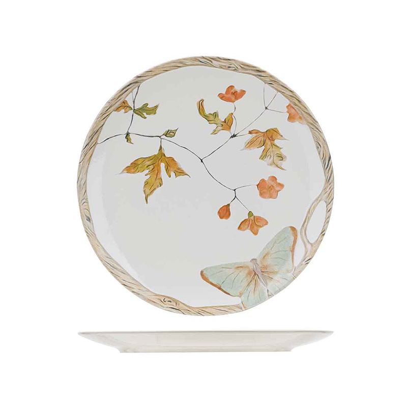 Plato llano con estampado de mariposas y hojas en suaves tonos pastel sobre fondo blanco.