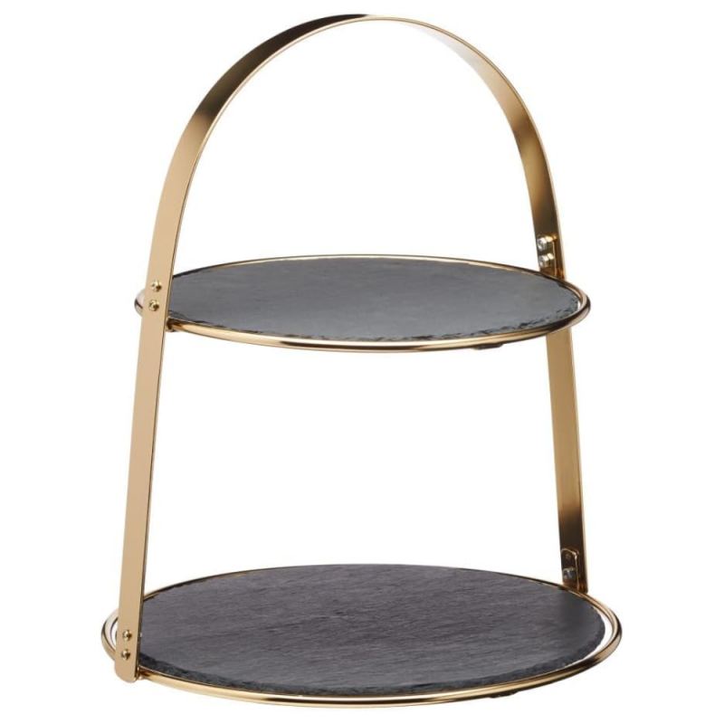 Fuente de servir de dos pisos redonda perfecto para servir pasteles, aperitivos, quesos o dulces con una presentación sofisticada. Ideal para cenas especiales, celebraciones, cócteles o mesas de buffet. Incluye la estructura metálica con acabado en bronce y dos bandejas circulares de pizarra natural totalmente desmontables.