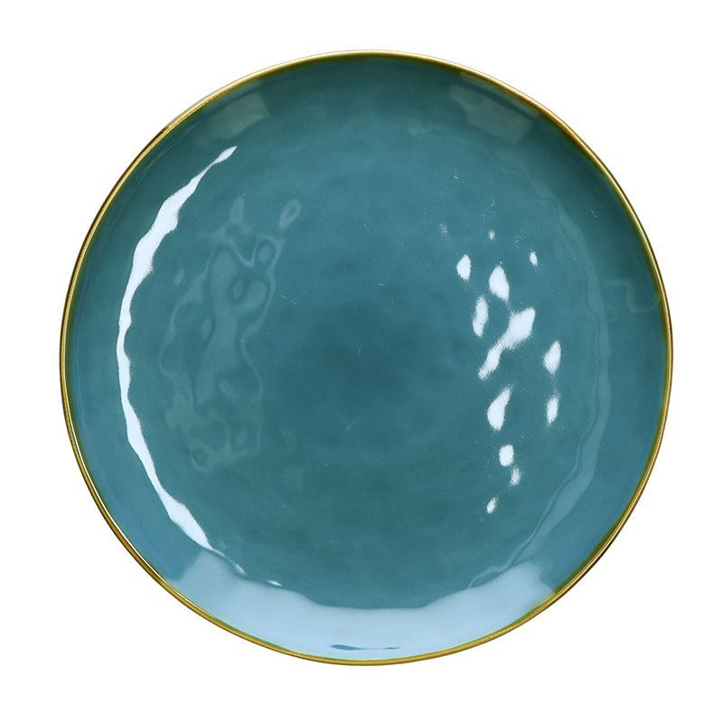 Fuente para servir redonda azul en gres, de 32 cm de diámetro. Esta fuente tiene un precioso esmaltado muy brillante y acabado irregular tanto en la superficie como en su borde de canto marrón claro. Con ella vestirás tu mesa de forma original y elegante.