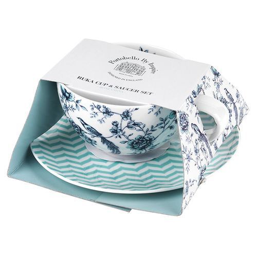 Esta taza con plato ofrece una forma elegante de disfrutar de tu taza de té o café. Diseño de flores y pájaro en azul cobalto y turquesa.