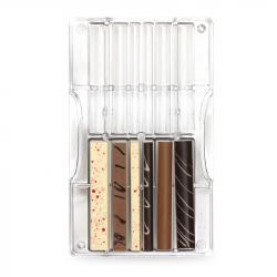 Molde para chocolate de 12 cavidades ¡ideal para hacer palitos de chocolate de distintos grosores y colores!. Este es un molde de policarbonato, material muy utilizado en la fabricación de bombones, ya que favorece el conseguir un acabado con brillante satinado en los bombones que hagas con él.