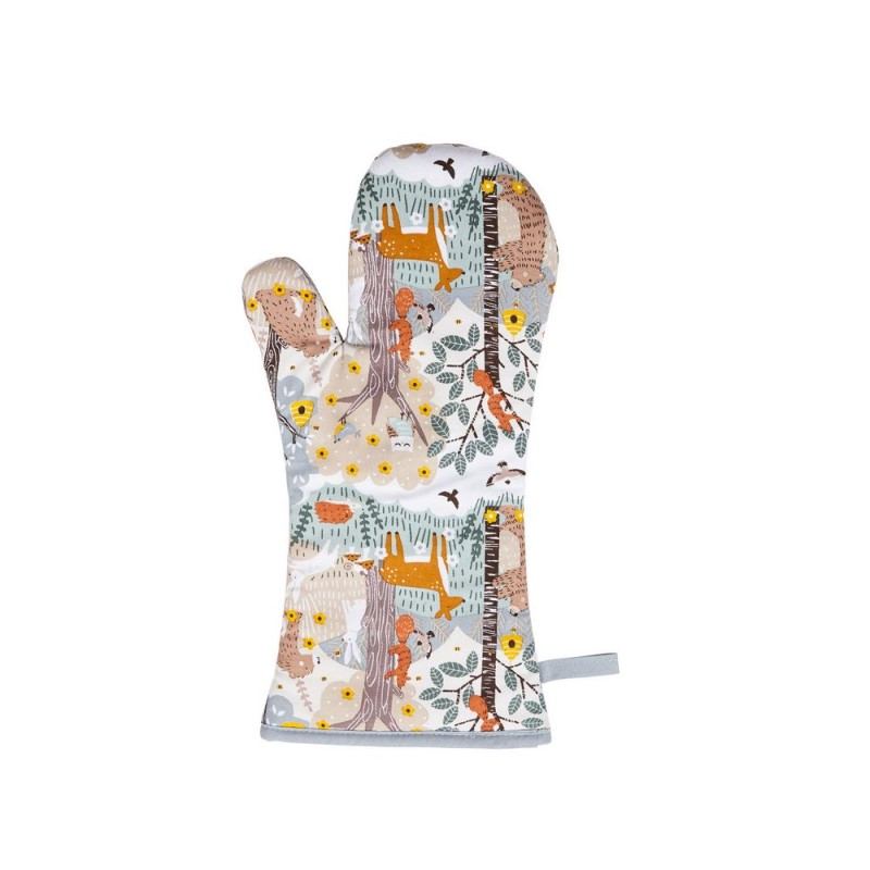 Manopla de cocina en algodón con estampado de bosque otoñal Wild Wood de Ulster Weavers donde diversos animales salvajes buscan comida y/o se preparan para la hibernación, en tonos fríos azules y verdes que contrastan con otros más cálidos como naranjas.