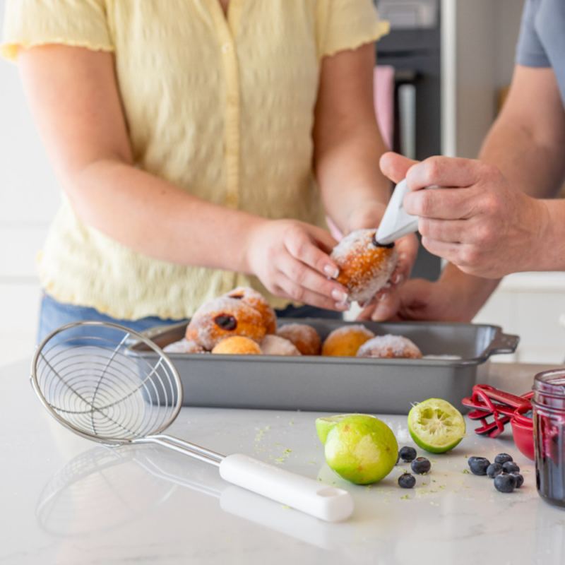 Espumadera de alambre KitchenAid idónea para retirar alimentos de aceite, agua y caldo caliente en frituras, guisos, hervidos, escaldados y escalfados. En color blanco porcelana