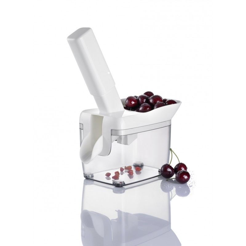 Deshuesador de cerezas con depósito de plástico. Practico para repostería y conservas.