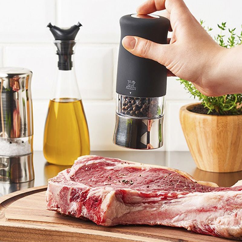 Salero eléctrico Peugeot Zeli en acero inoxidable cepillado. Con este molino de sal innovación y tecnología entran en tu cocina, ya que podrás sazonar sal al gusto con tan solo pulsar un botón. En el momento de pulsar se encenderá una luz de control indicadora de que se está echando sal y cuando consideres que tienes suficiente, se deja de pulsar y listo. ¡Así de sencillo!